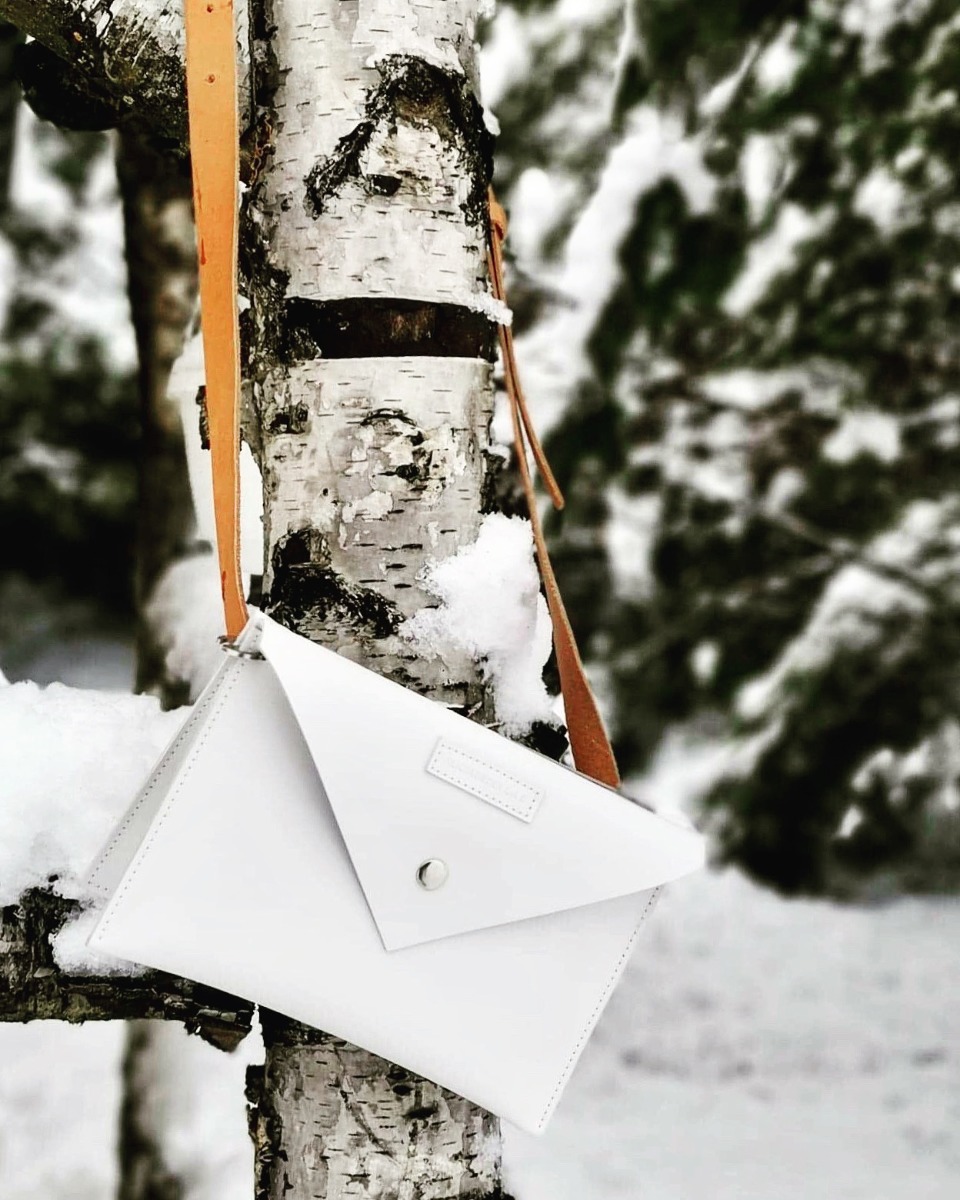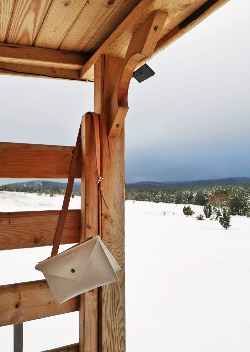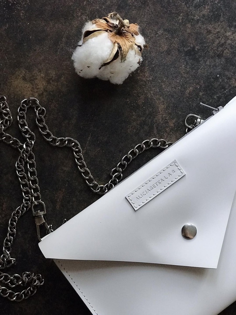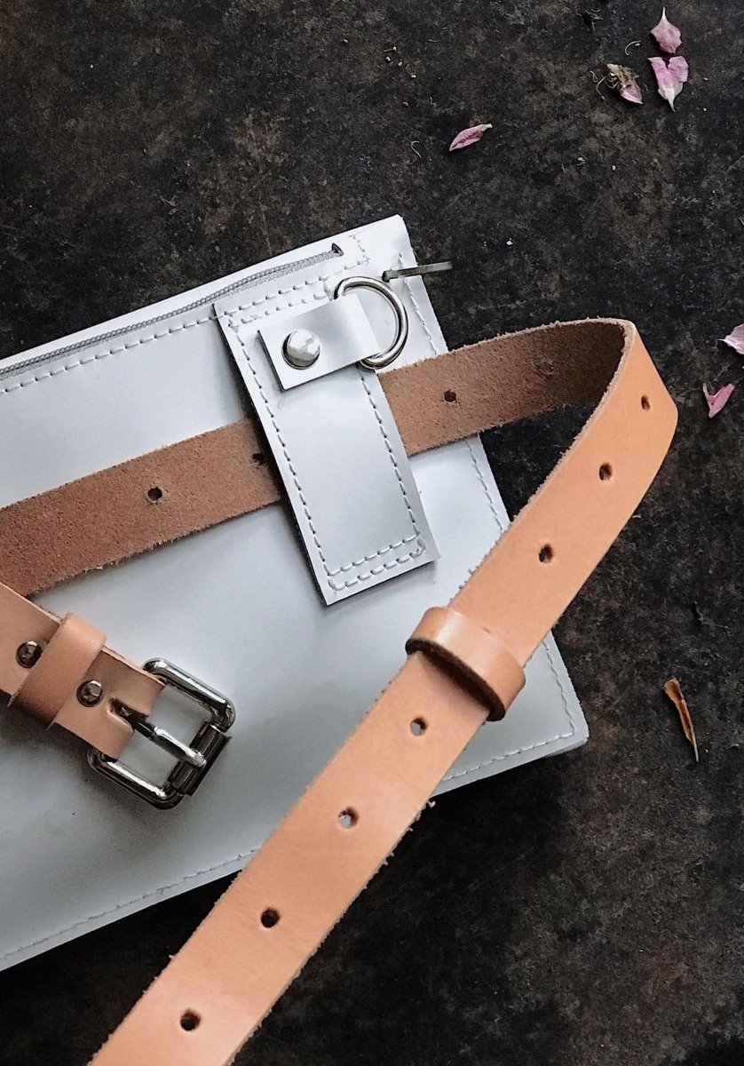 - The set includes a belt pouch bag, chain in silver color and leather strap in natural color
