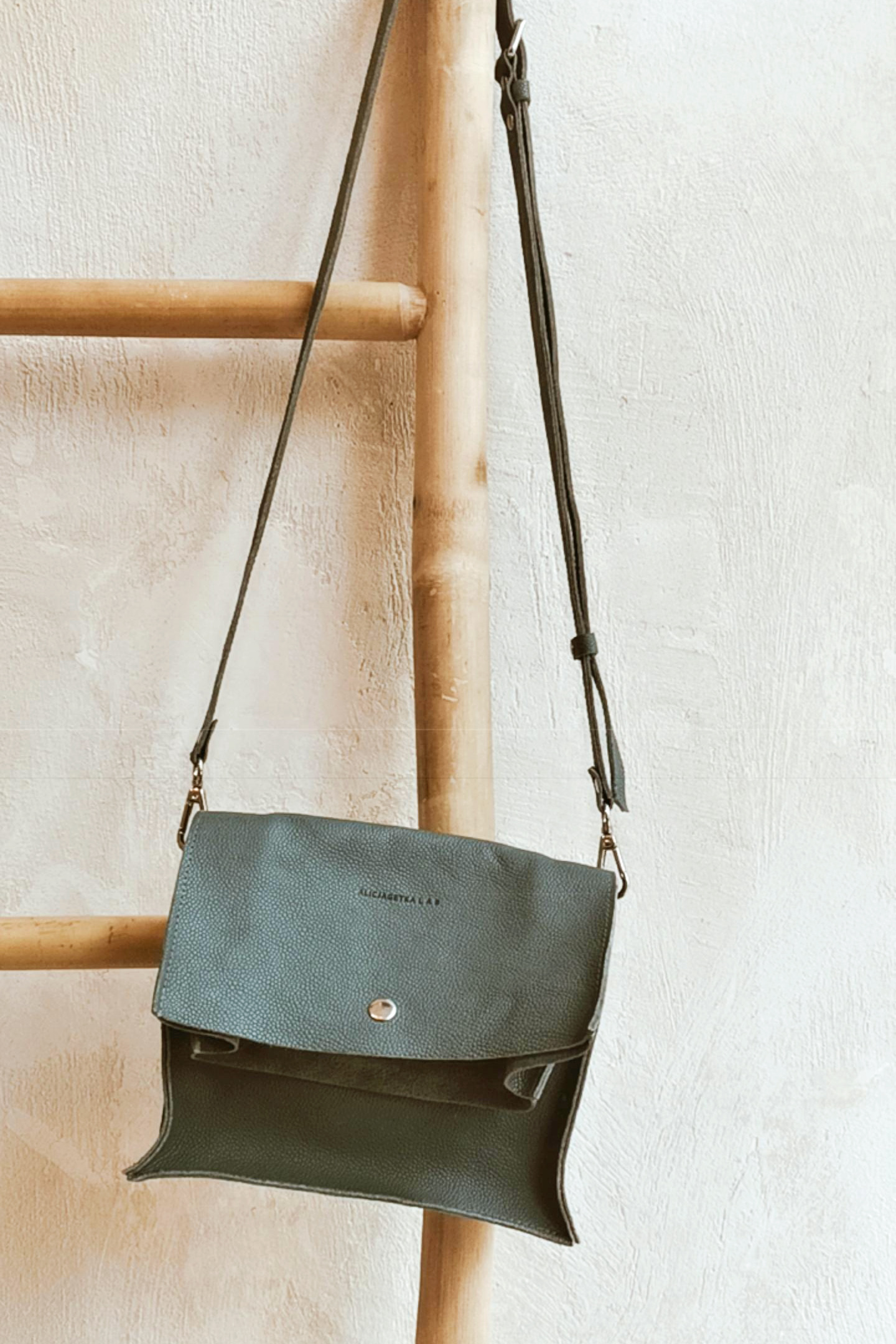- the flap either folds in half over the contents placed inside, or remains vertical (when the bag is more full).