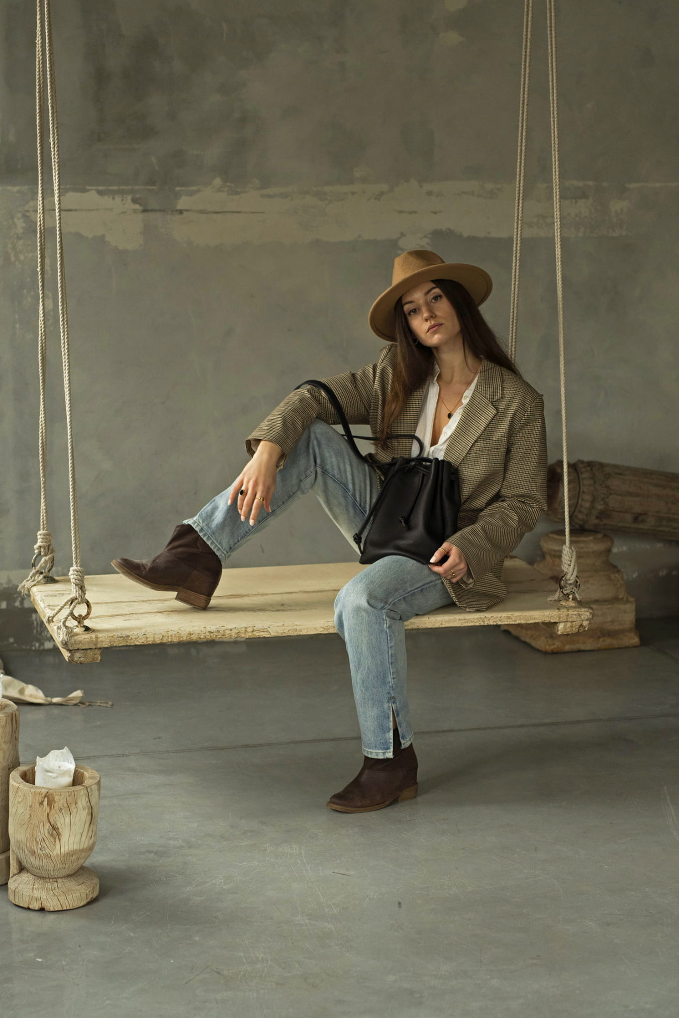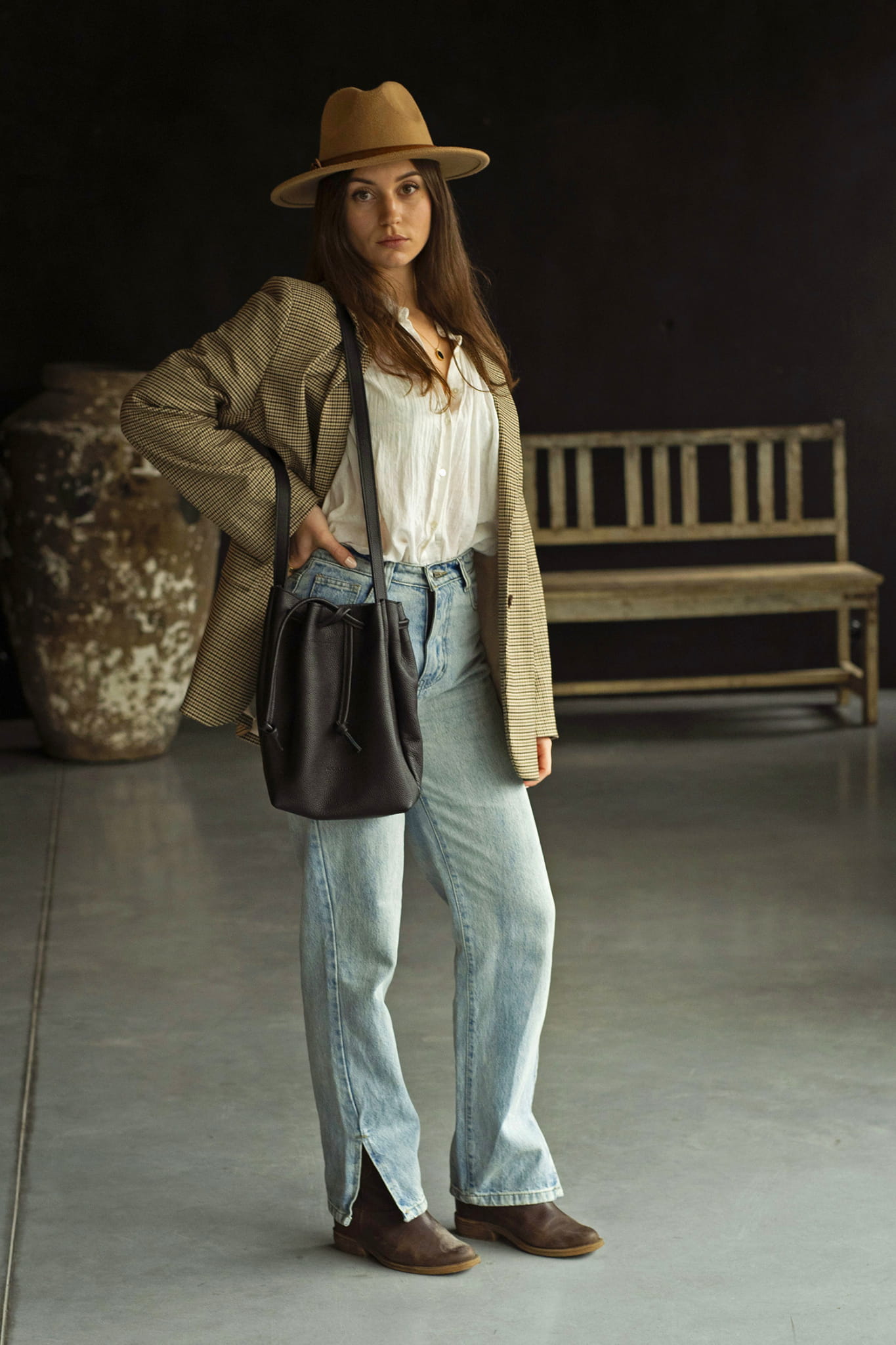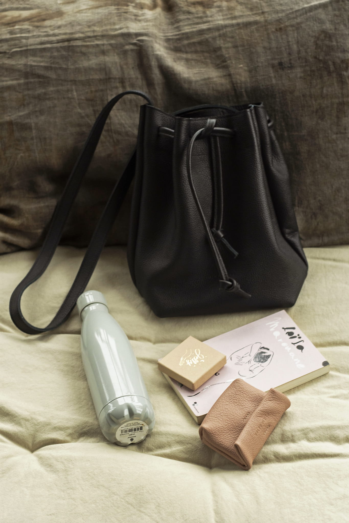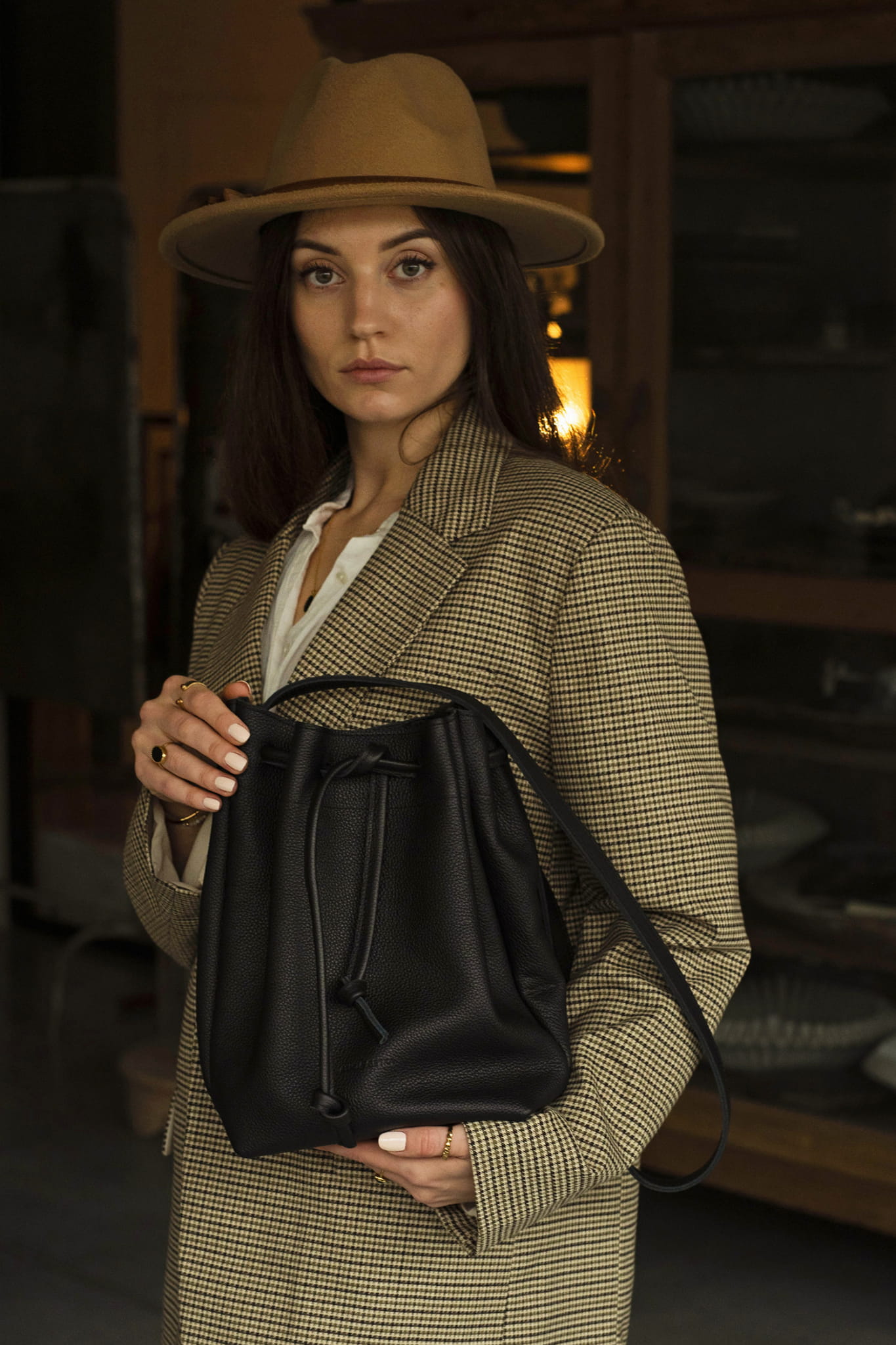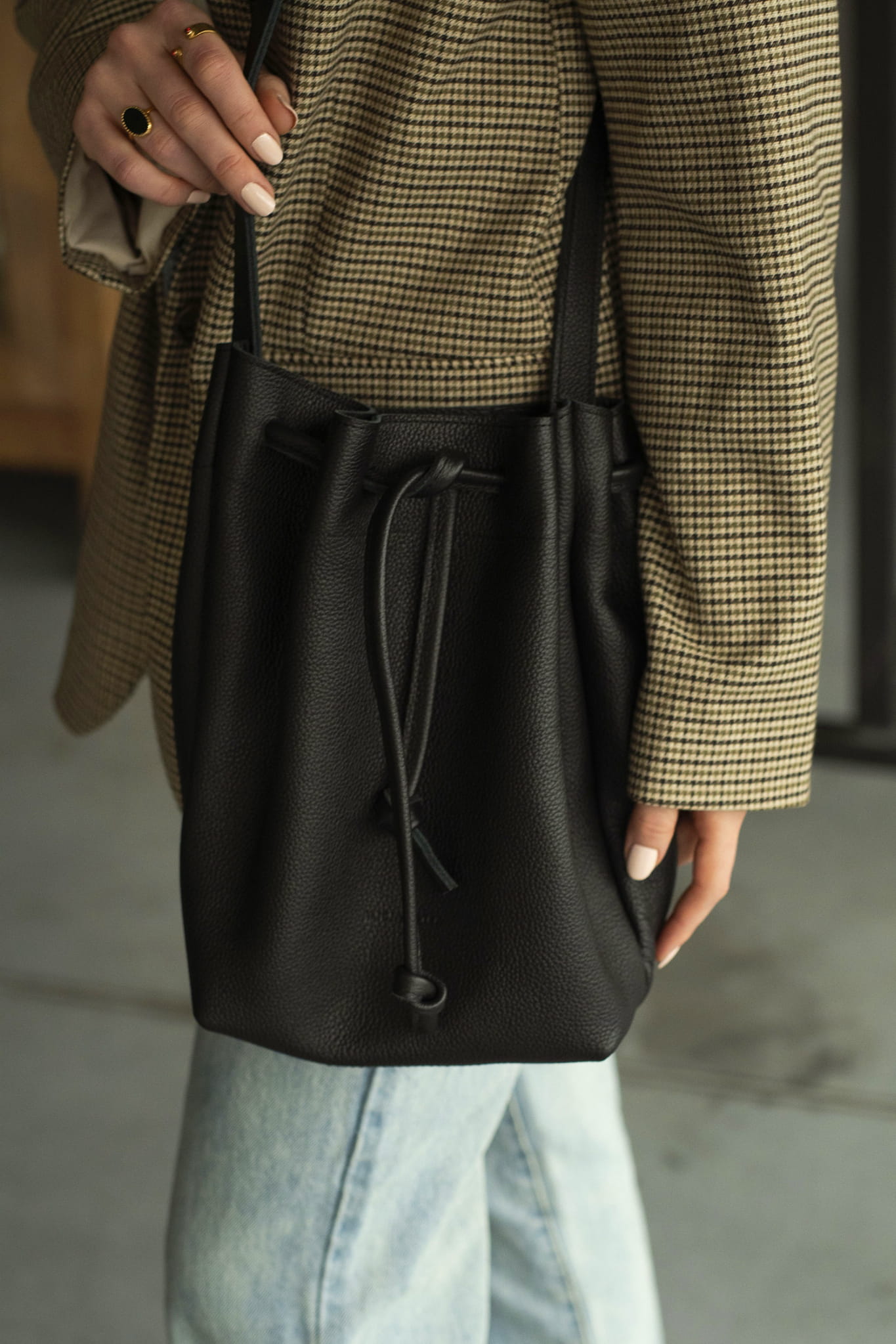 Our version of the bag in the form of a medium-sized tied bag with an adjustable strap.