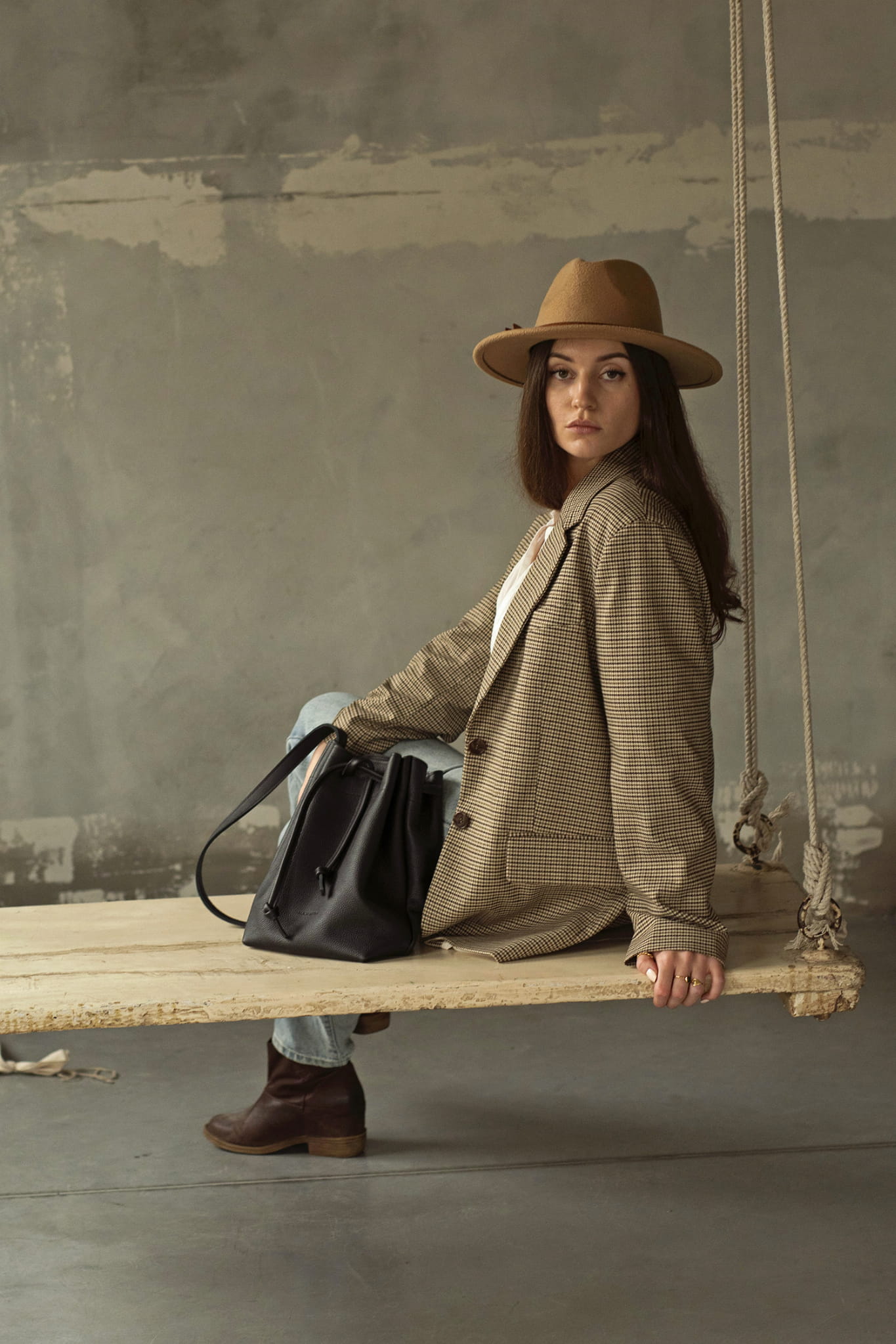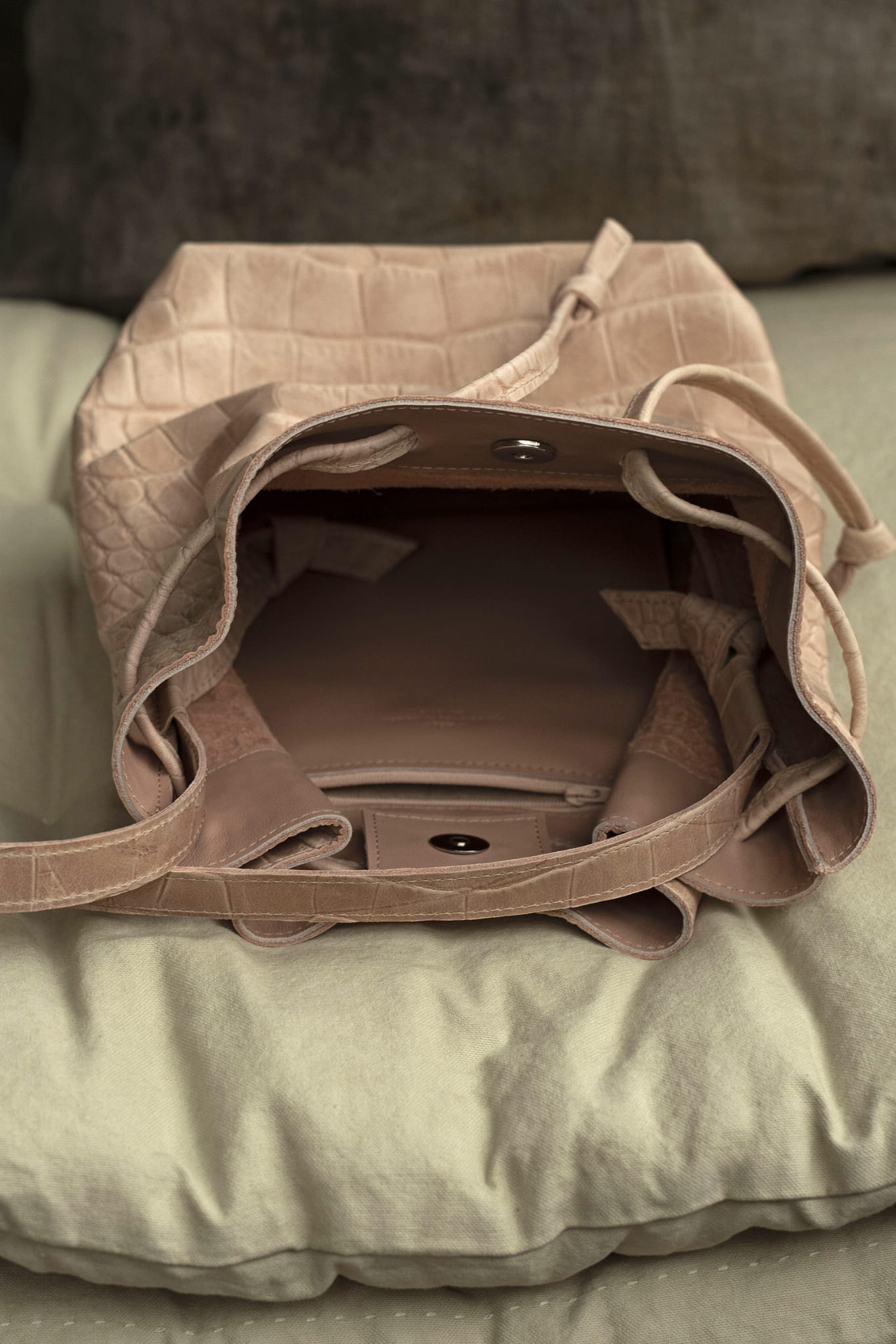- long shoulder strap with adjustable length - strap fastening and adjustment without metal fittings, discreetly placed inside the bag. Adjustment is done by tying a knot on the strap at the selected height